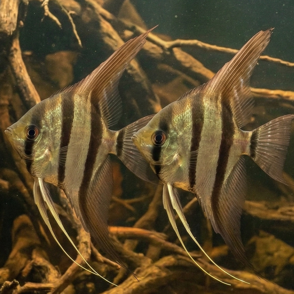 In the wild, Orinoco Altum Angelfish inhabit slow-moving blackwater tributaries and flooded forest areas of the Orinoco River system. These waters are typically warm, soft, and acidic with large amounts of tannins released from decaying leaves and wood.