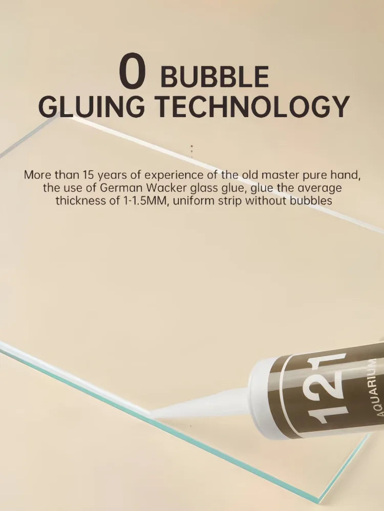 Each YEE aquarium is hand-assembled by a master craftsman with over 15 years of experience. Using premium German WACKER glass glue, the joints are filled with uniform adhesive layers (1–1.5MM thick), free of bubbles, and built for long-lasting durability and water-tightness.
